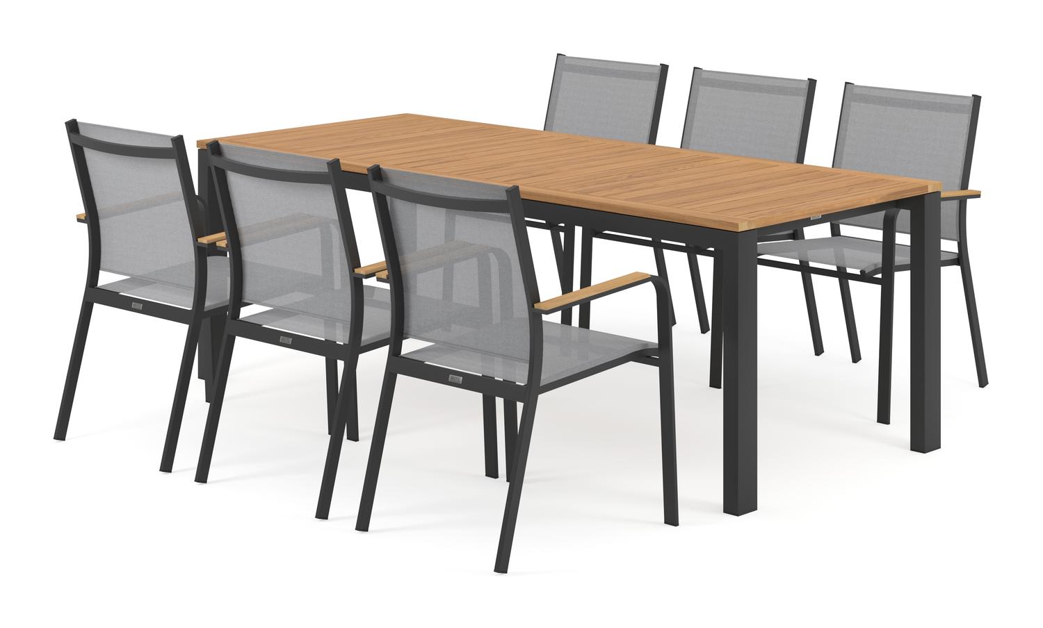 De Trente tuinset in zwart aluminium en teak tafelblad met 6 stapelbare Amalfi tuinstoelen is van het merk Bristol Essentials en is hier verkrijgbaar in de kleur zwart/grijs/naturel.