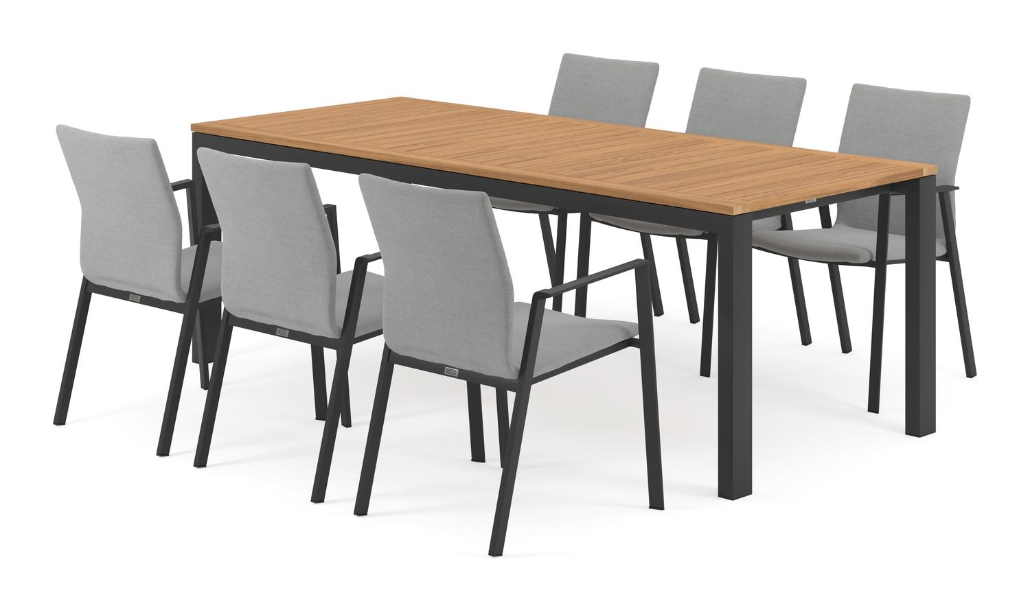 De Trente tuinset in zwart aluminium en teak tafelblad met 6 stapelbare Madura tuinstoelen is van het merk Bristol Essentials en is hier verkrijgbaar in de kleur zwart/grijs/naturel.