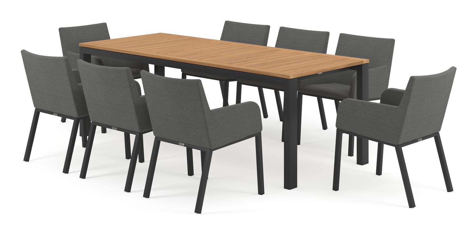 De Trente tuinset in zwart aluminium en teak tafelblad met 8 Rivo tuinstoelen is van het merk Bristol Essentials en is hier verkrijgbaar in de kleur zwart/naturel/grijs.