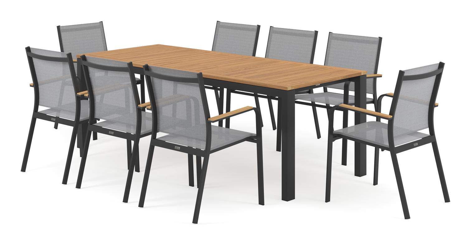 De Trente tuinset in zwart aluminium en teak tafelblad met 8 stapelbare Amalfi tuinstoelen is van het merk Bristol Essentials en is hier verkrijgbaar in de kleur zwart/grijs/naturel.