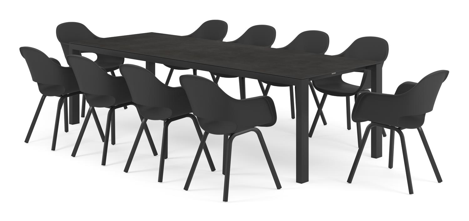 De Trente tuinset in zwart aluminium en zwart volkeramiek tafelblad met 10 Artena tuinstoelen is van het merk Bristol Essentials en is hier verkrijgbaar in de kleur zwart.