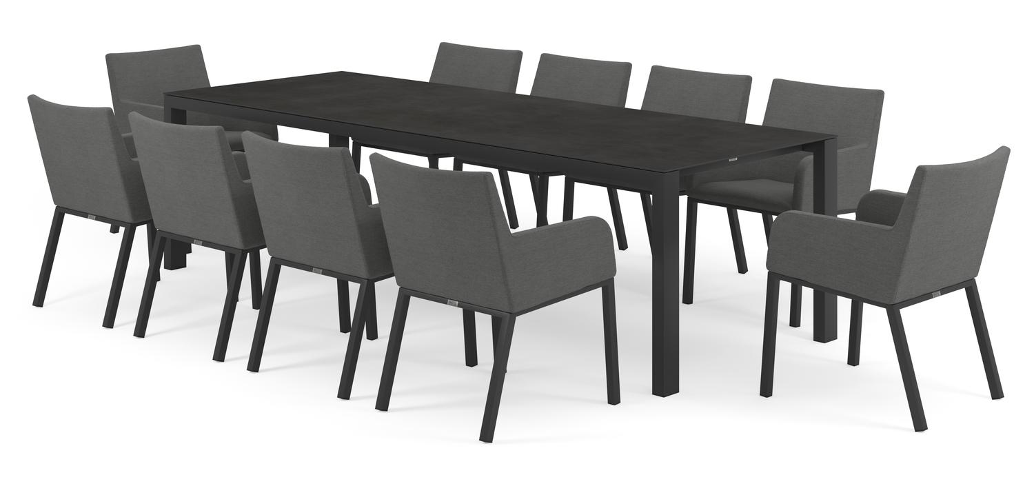 De Trente tuinset in zwart aluminium en zwart volkeramiek tafelblad met 10 Rivo tuinstoelen is van het merk Bristol Essentials en is hier verkrijgbaar in de kleur zwart/grijs.