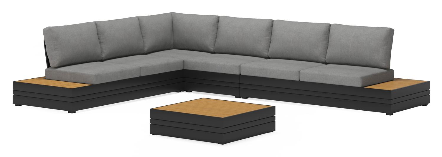 De Valongo loungehoek in zwart aluminium en met grijs polyester kussens en loungetafel is van het merk Vinci en is hier verkrijgbaar in de kleur zwart.