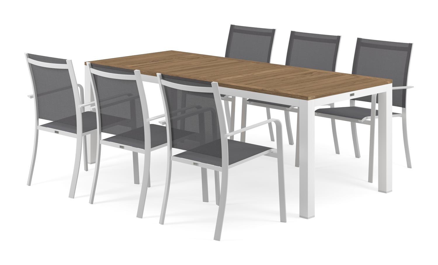 Varese tuinset in wit aluminium en colour finish teak tafelblad met 6 stapelbare Calobra tuinstoelen