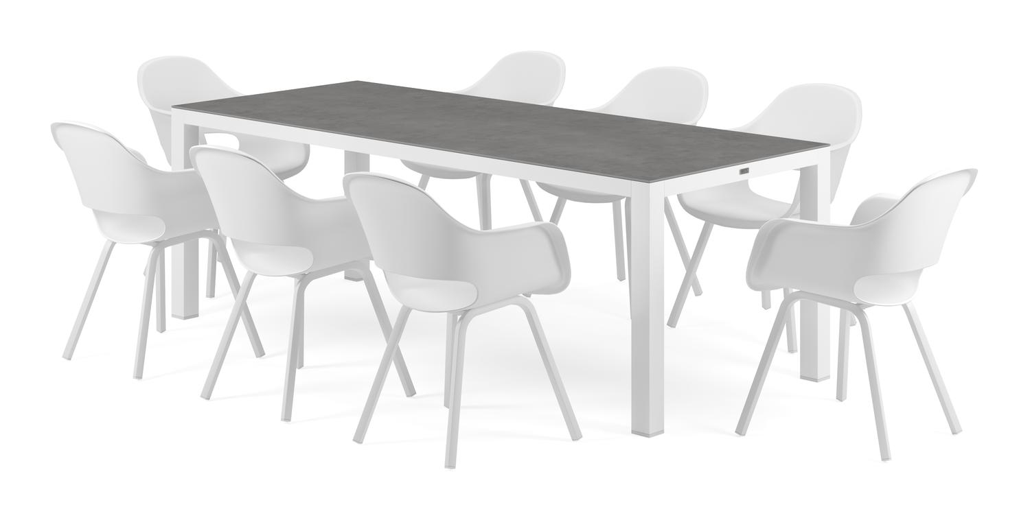 De Varese tuinset in wit aluminium en grijs volkeramiek tafelblad met 8 Artena tuinstoelen is van het merk Bristol Essentials en is hier verkrijgbaar in de kleur grijs/wit.