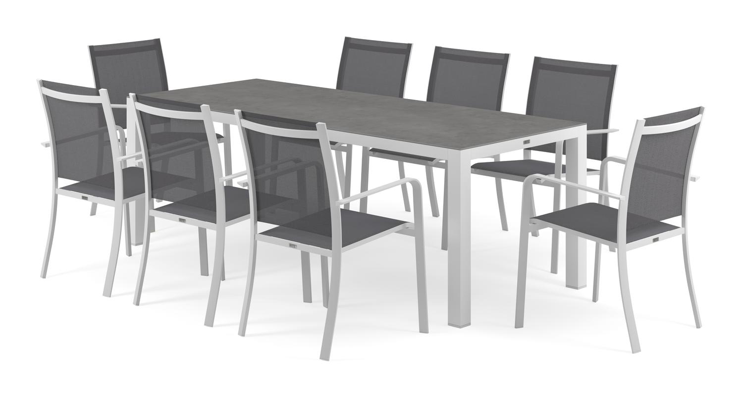 De Varese tuinset in wit aluminium en grijs volkeramiek tafelblad met 8 stapelbare Calobra tuinstoelen is van het merk Bristol Essentials en is hier verkrijgbaar in de kleur grijs/wit.
