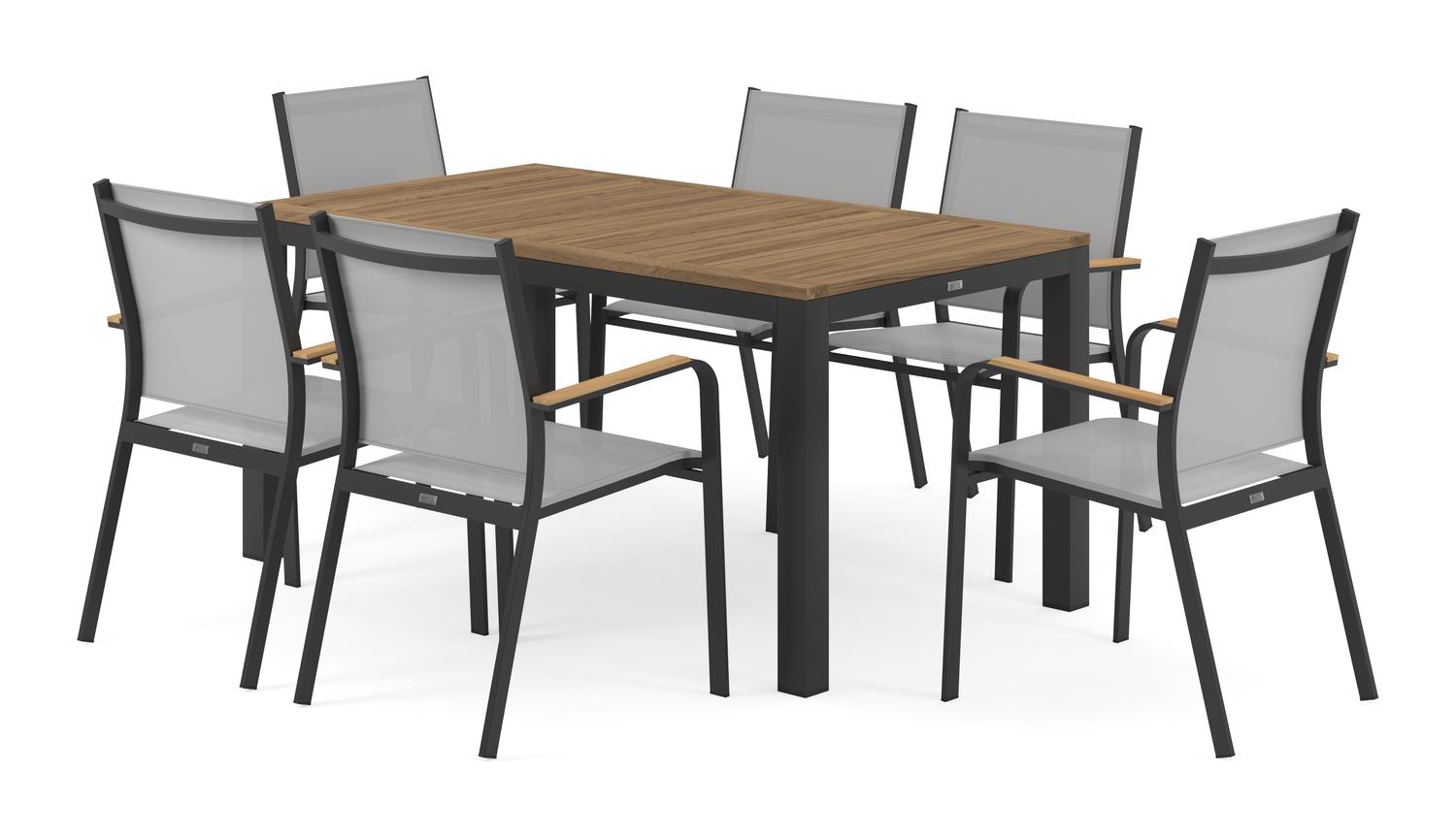 Varese tuinset in zwart aluminium en colour finish teak tafelblad met 6 stapelbare Amalfi tuinstoelen