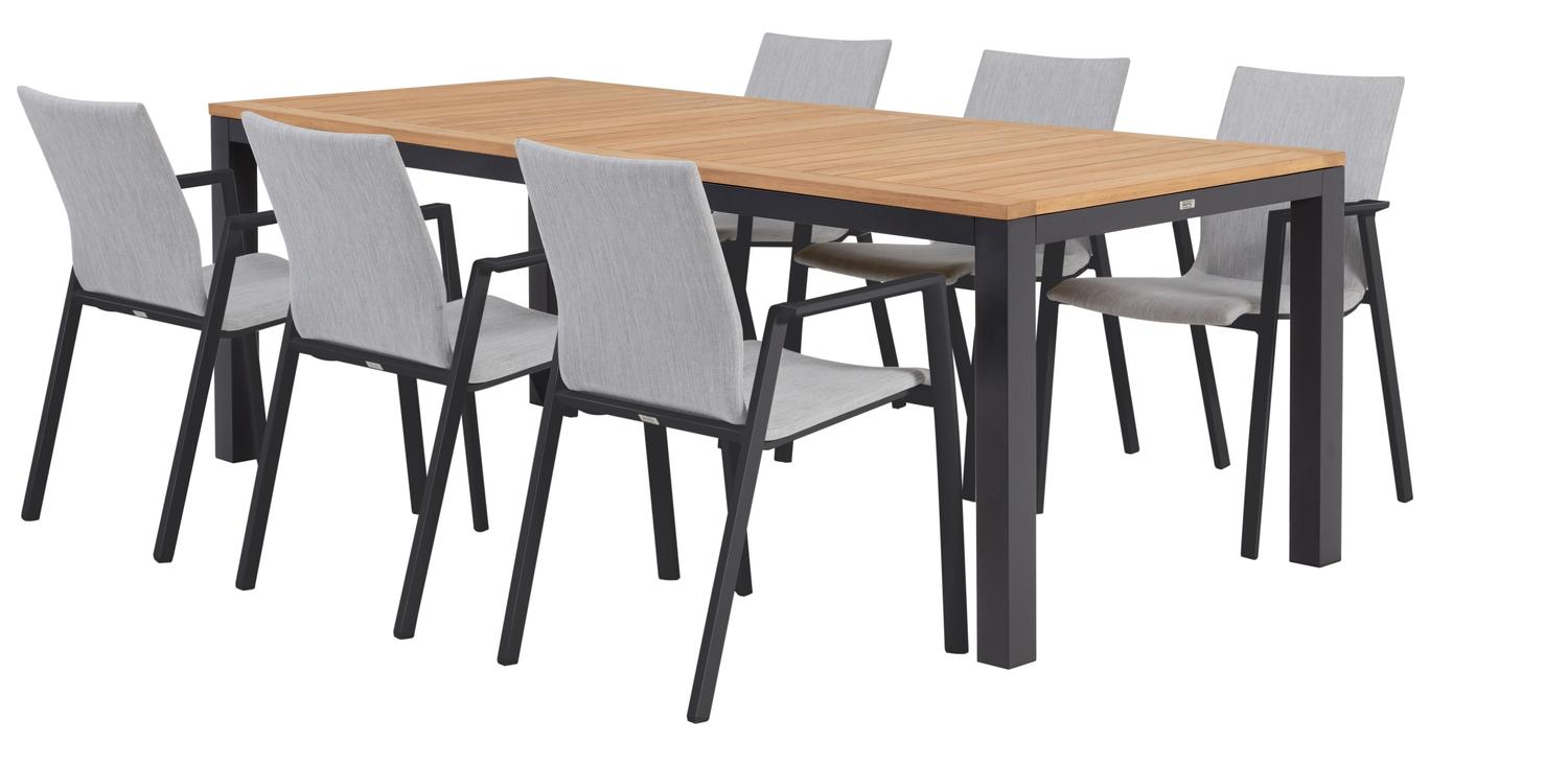 Varese tuinset in zwart aluminium en colour finish teak tafelblad met 6 stapelbare Madura tuinstoelen