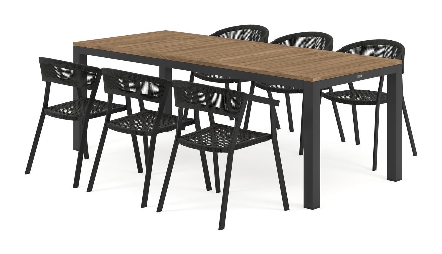 De Varese tuinset in zwart aluminium en colour finish teak tafelblad met 6 stapelbare Viaro tuinstoelen is van het merk Bristol Essentials en is hier verkrijgbaar in de kleur zwart/naturel.