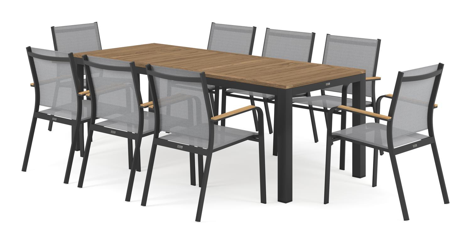 De Varese tuinset in zwart aluminium en colour finish teak tafelblad met 8 stapelbare Amalfi tuinstoelen is van het merk Bristol Essentials en is hier verkrijgbaar in de kleur zwart/grijs/naturel.