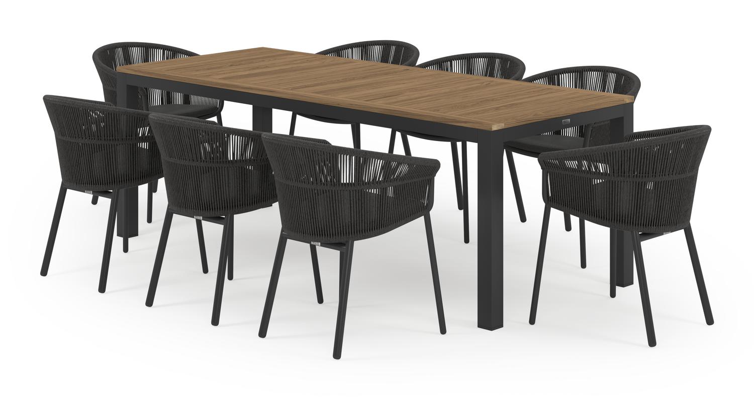 De Varese tuinset in zwart aluminium en colour finish teak tafelblad met 8 stapelbare Matera tuinstoelen is van het merk Bristol Essentials en is hier verkrijgbaar in de kleur zwart/naturel.