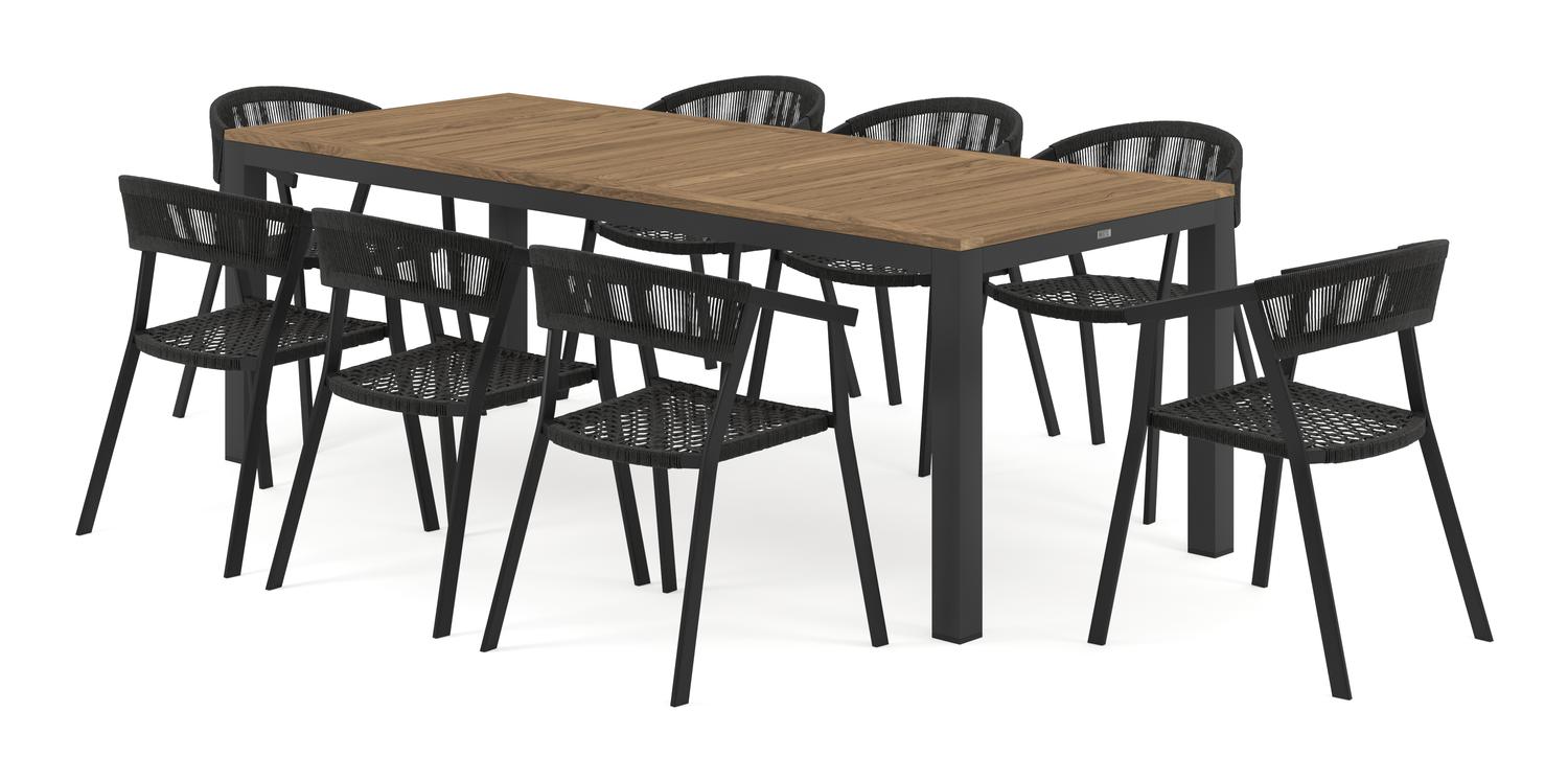 De Varese tuinset in zwart aluminium en colour finish teak tafelblad met 8 stapelbare Viaro tuinstoelen is van het merk Bristol Essentials en is hier verkrijgbaar in de kleur zwart/naturel.