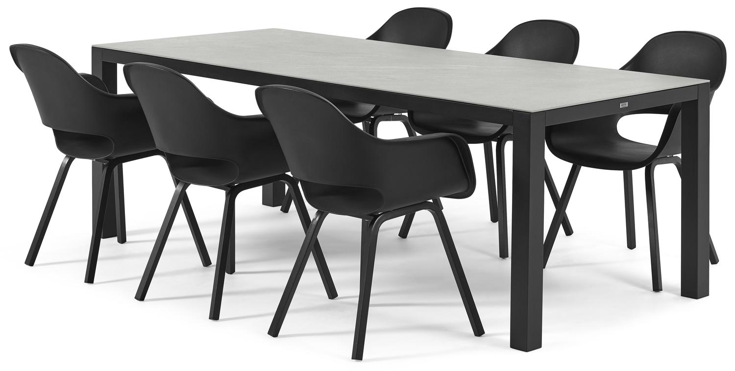 De Varese tuinset in zwart aluminium en grijs volkeramiek tafelblad met 6 Artena tuinstoelen is van het merk Bristol Essentials en is hier verkrijgbaar in de kleur zwart/grijs.