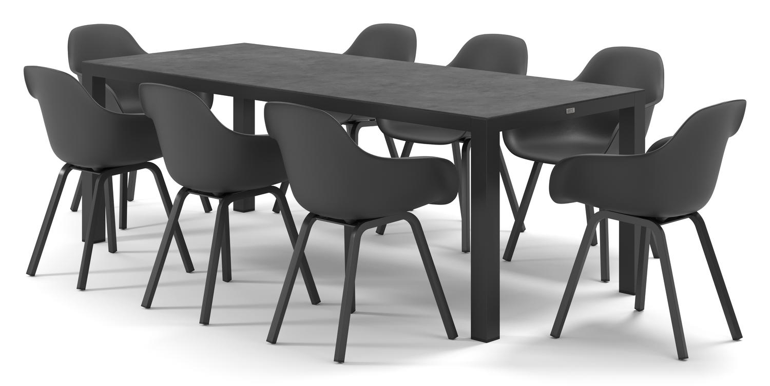 De Varese tuinset in zwart aluminium en grijs volkeramiek tafelblad met 8 Puglia tuinstoelen is van het merk Bristol Essentials en is hier verkrijgbaar in de kleur zwart/grijs.