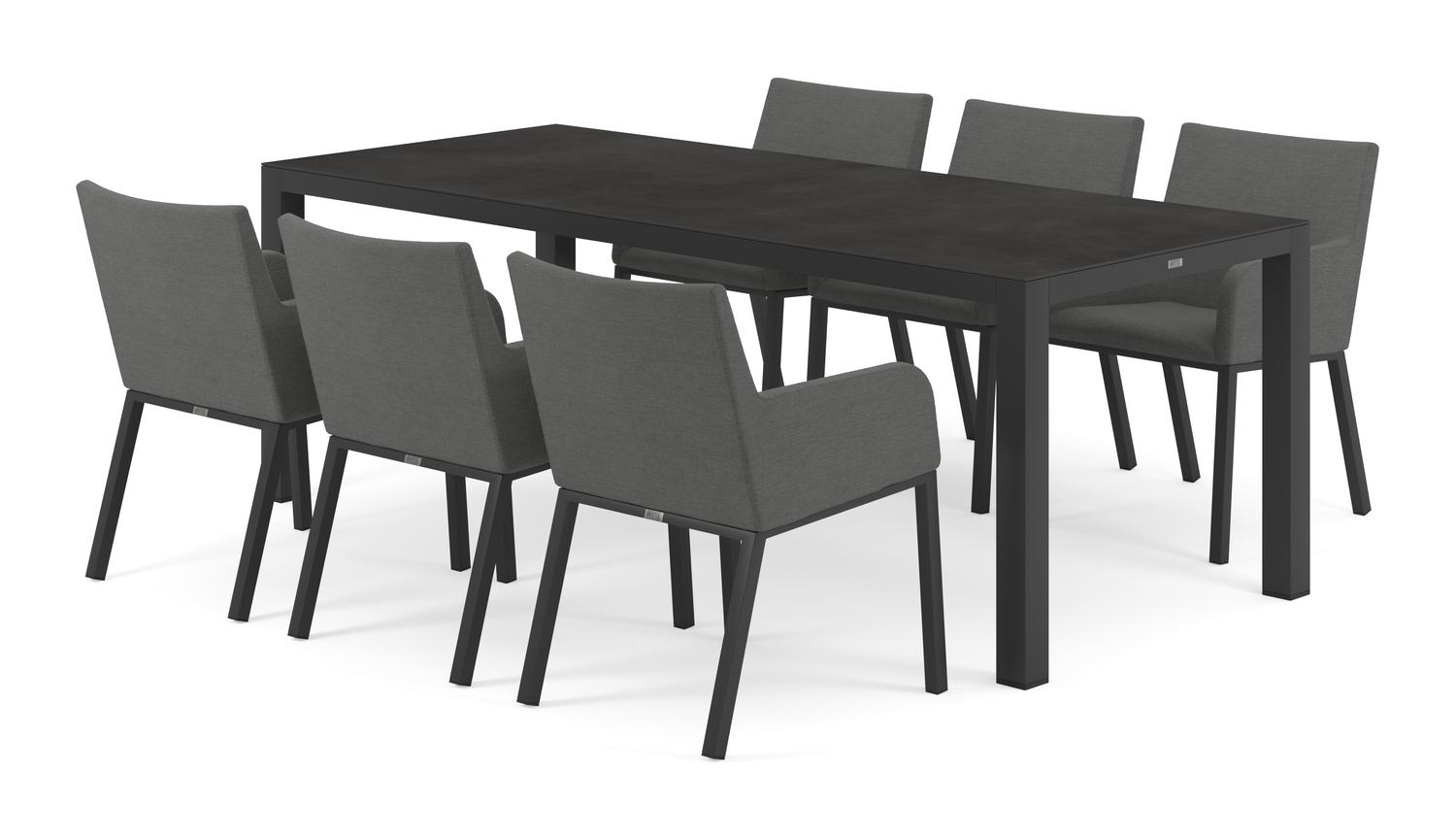 De Varese tuinset in zwart aluminium en zwart volkeramiek tafelblad met 6 Rivo tuinstoelen is van het merk Bristol Essentials en is hier verkrijgbaar in de kleur zwart/grijs.
