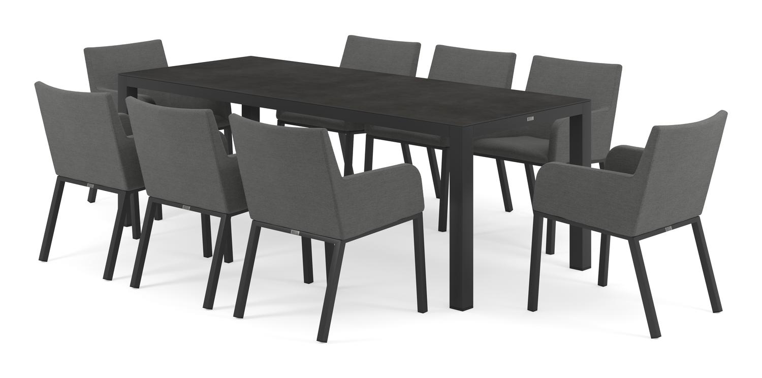 De Varese tuinset in zwart aluminium en zwart volkeramiek tafelblad met 8 Rivo tuinstoelen is van het merk Bristol Essentials en is hier verkrijgbaar in de kleur zwart/grijs.