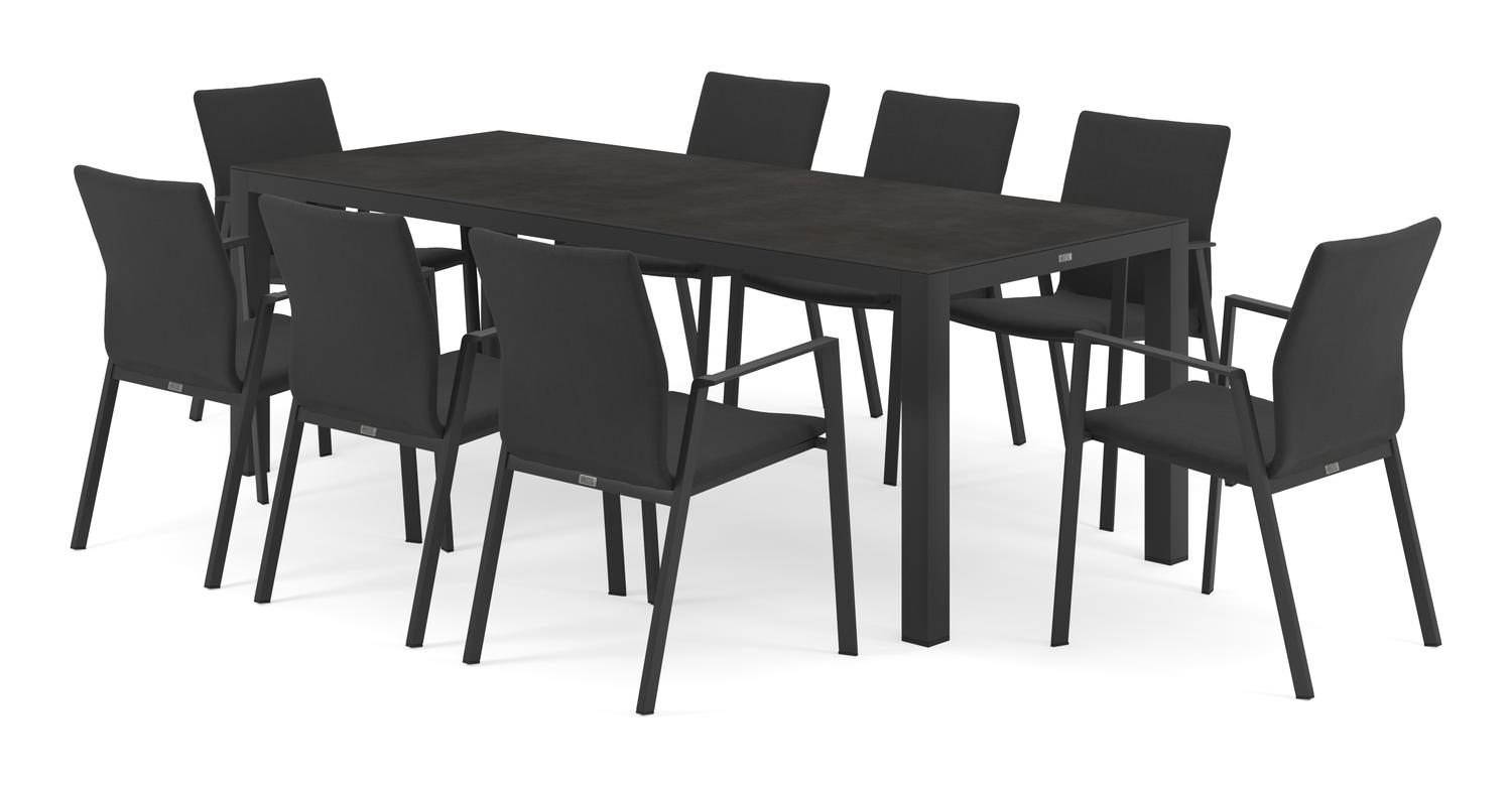 De Varese tuinset in zwart aluminium en zwart volkeramiek tafelblad met 8 stapelbare Madura tuinstoelen is van het merk Bristol Essentials en is hier verkrijgbaar in de kleur zwart.