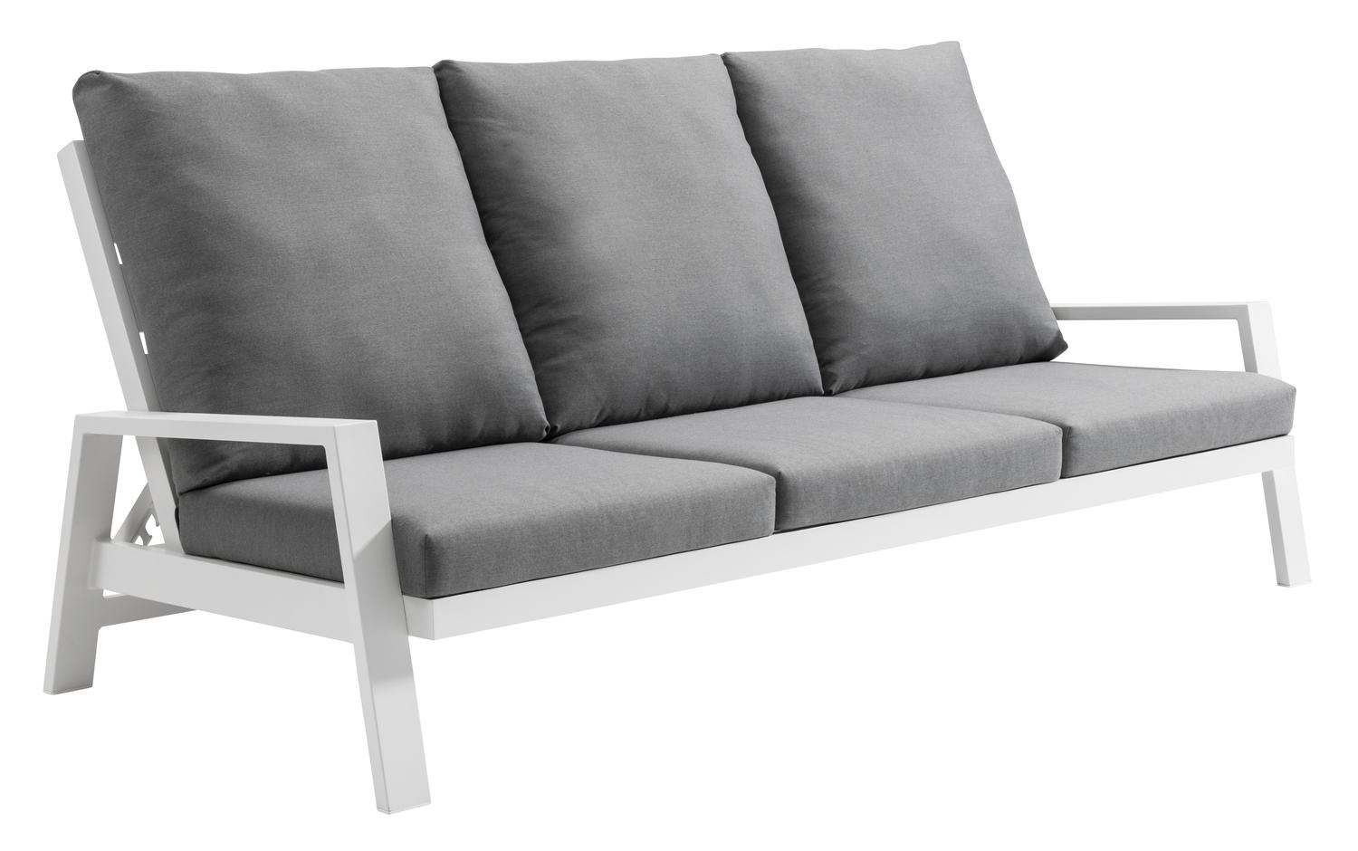Lounge 3-zit in wit mat aluminium. Met 2 armleuningen en 3 afzonderlijk verstelbare rugleuningen in 4 standen. Zit- en rugkussens inbegrepen in grijze Weather+ Softtouch stof. Totale afmetingen: B 232 x D 103 x H 92,5 cm. Hoogte armleuningen: 55 cm.