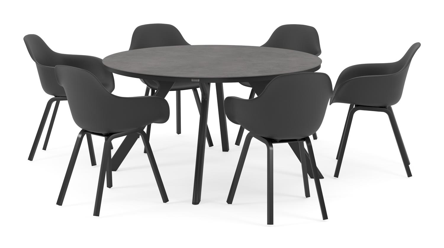 De Viaro tuinset in zwart aluminium en grijs volkeramiek tafelblad met 6 Puglia tuinstoelen is van het merk Bristol Essentials en is hier verkrijgbaar in de kleur zwart/grijs.