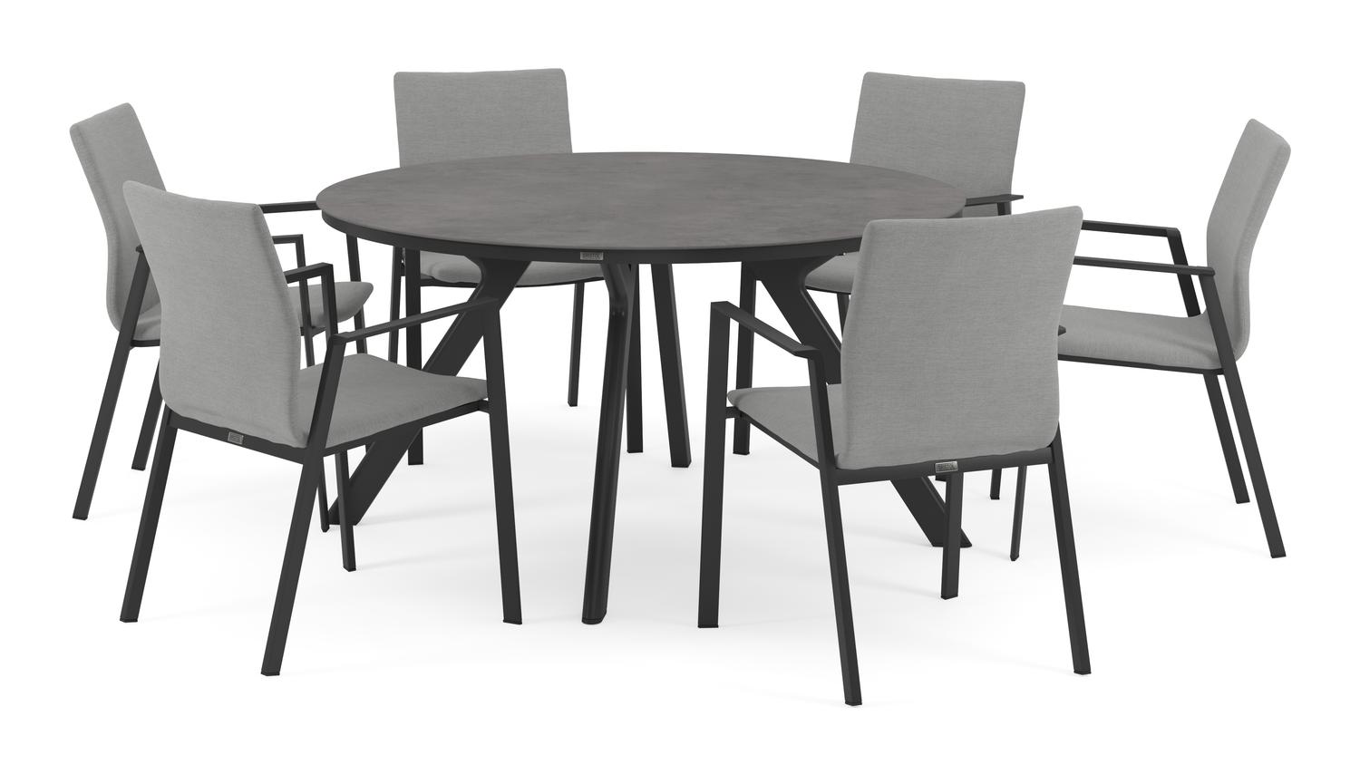 De Viaro tuinset in zwart aluminium en grijs volkeramiek tafelblad met 6 stapelbare Madura tuinstoelen is van het merk Bristol Essentials en is hier verkrijgbaar in de kleur zwart/grijs.