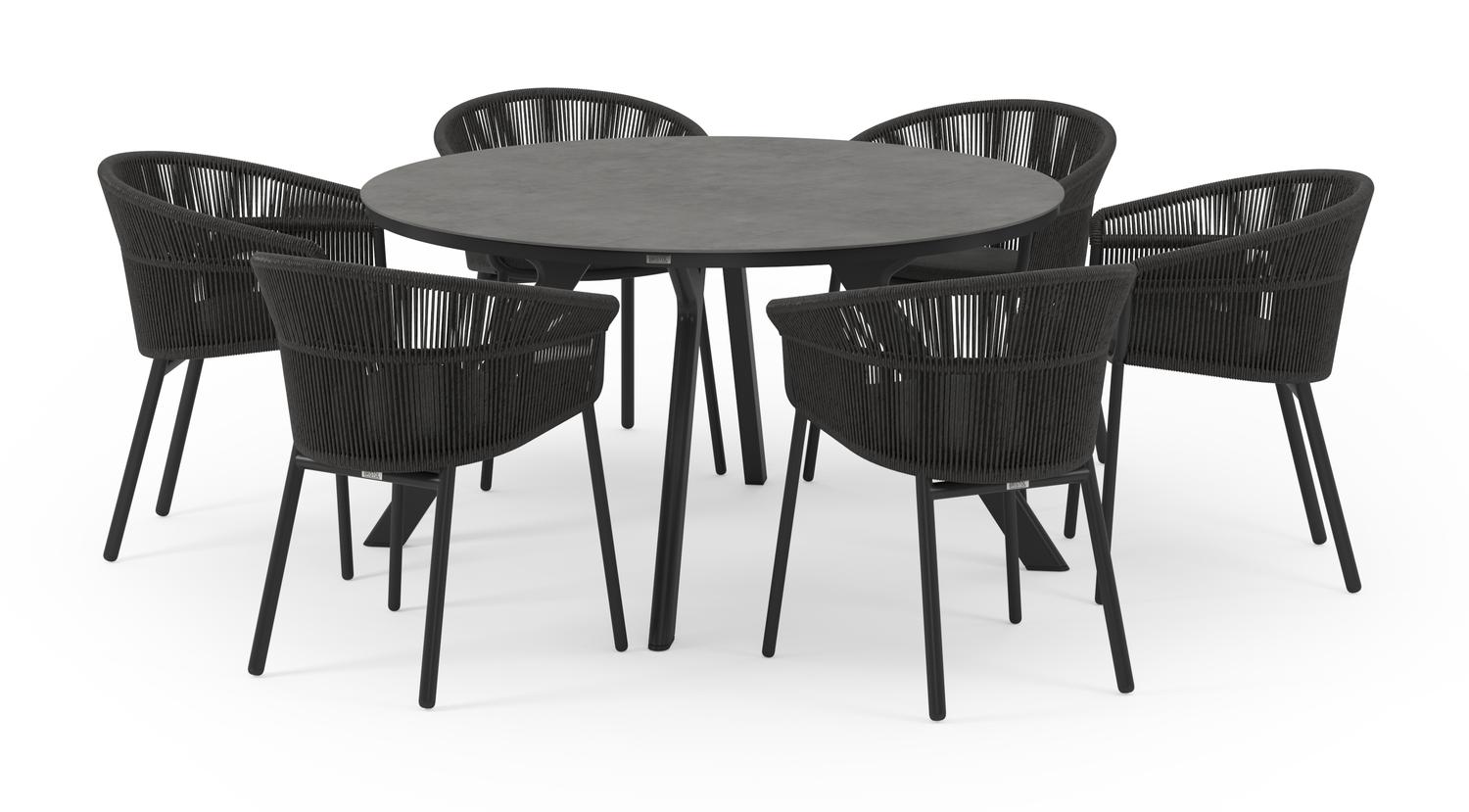 De Viaro tuinset in zwart aluminium en grijs volkeramiek tafelblad met 6 stapelbare Matera tuinstoelen is van het merk Bristol Essentials en is hier verkrijgbaar in de kleur zwart/grijs.